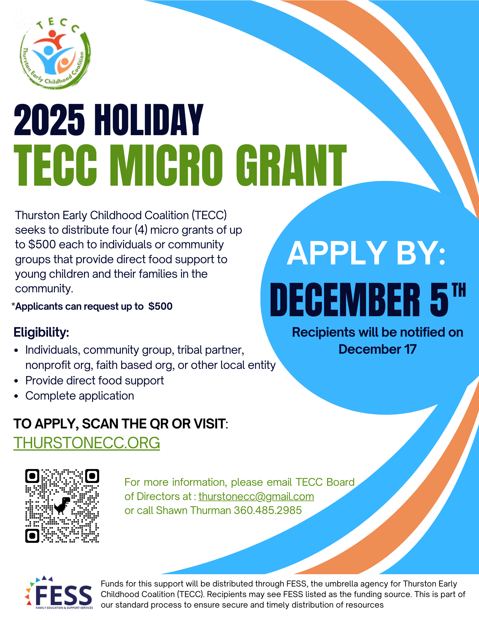 TECC seeks to distribute four (4) micro-grants of up to $500 each to individuals or organizations that can provide direct food support to young children in our community and their families. With the upcoming holiday season and reductions in federal food assistance, TECC aims to responsibly spend down existing funds to meet urgent community needs. This micro-grant program is designed to be simple, transparent, and accessible to both established organizations and trusted community members.